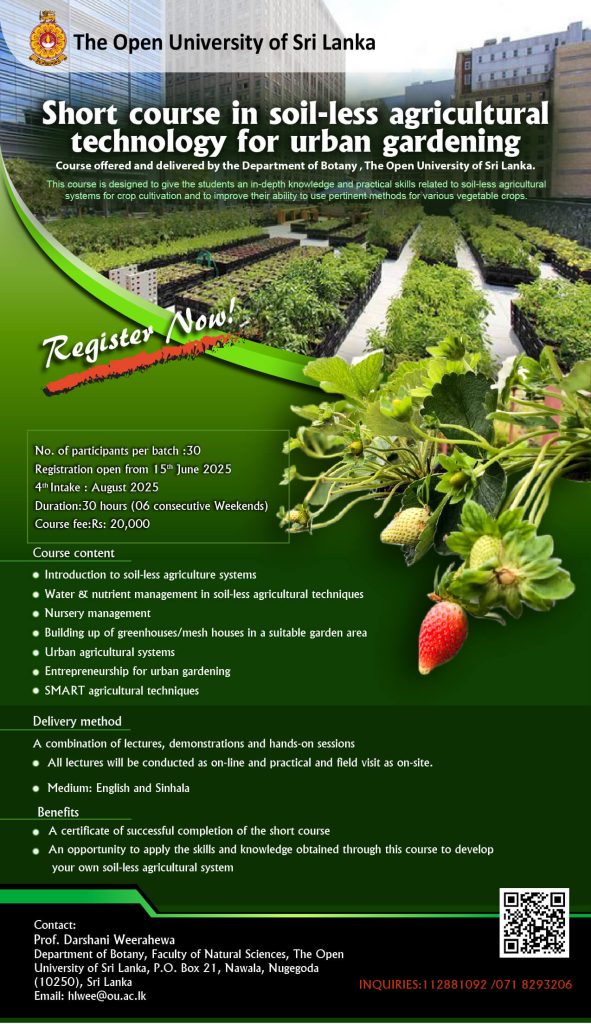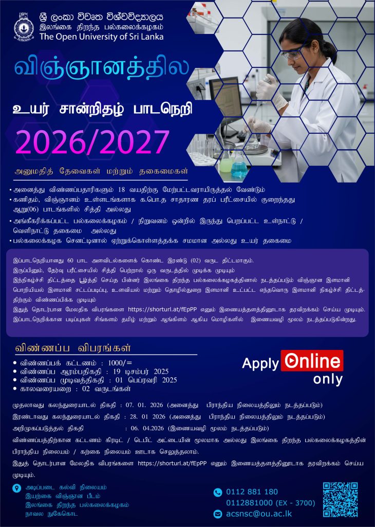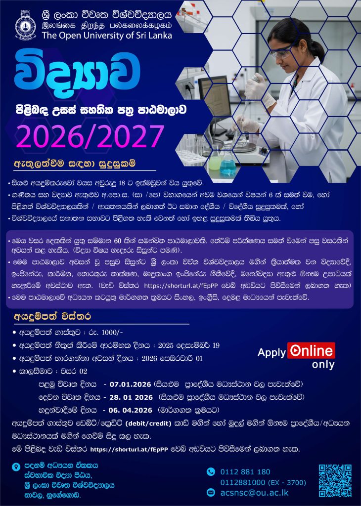2. Obtained the Advanced Certificate in Science with courses from any three disciplines offered by the Open University of Sri Lanka