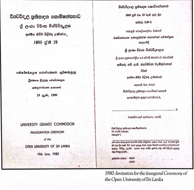 Commenting on the establishment of the Open University, Professor P D Gunatilleke, the first Vice- Chancellor asserts that the realization of a need to offer the public a second opportunity in education was one of the highlights of the manifesto of the United National Party, the party that won the election in 1977. He believes that this was the first time the idea of an Open University was set down in “black and white
